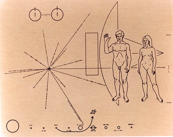 “The “Pioneer Plaque,” designed by Carl Sagan to be on board the Pioneer 10 and Pioneer 11 spacecraft, launched in 1972 and 1973 (the first spacecraft to leave the Solar System). Courtesy of NASA.